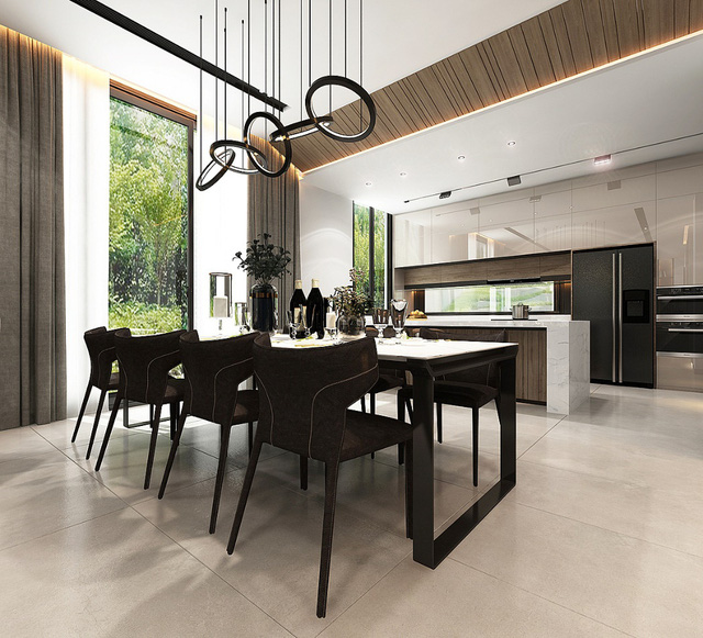 Việc bố trí công năng sử dụng của biệt thự cũng thể hiện chất hiện đại, phóng khoáng của thời đại khi tạo ra không gian sống cởi mở. Toàn bộ khu vực sảnh vào kết nối phòng khách – bếp – phòng ăn tạo thành một không gian hài hòa rộng mở cho cả gia đình.